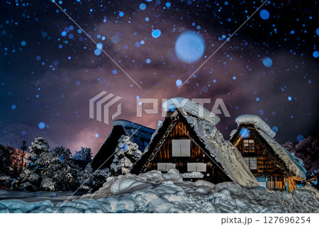 這張照片是在京都南丹市美山町被雪覆蓋的茅草屋頂村拍攝的。