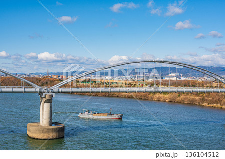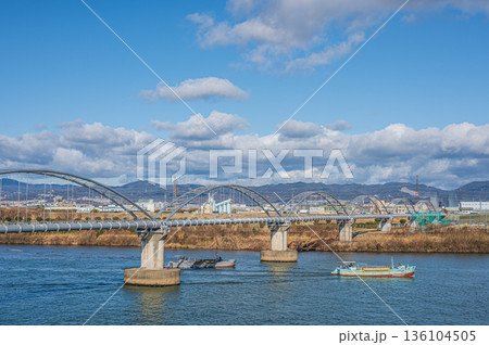淀川上的輸水管橋和一艘運沙船。從枚方橋上看到的景色。