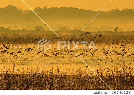 鵝在宮城縣歌舞伎沼棲息,在橙色的夕陽下
