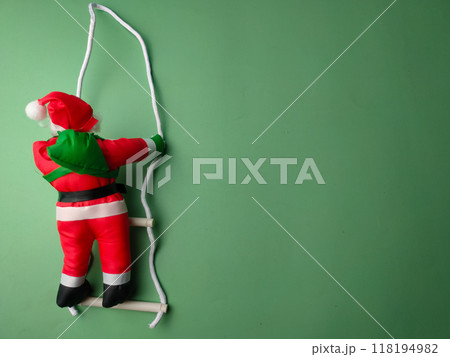 A statue of Santa Claus climbing the stairs on a green background with copy and text space.