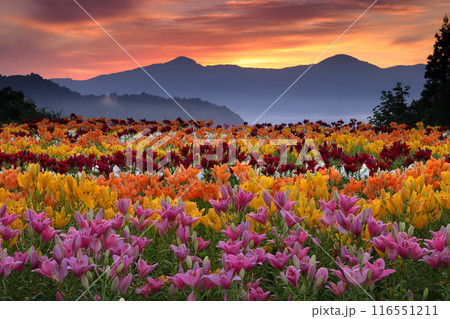 新潟縣魚沼市堀之內,月岡公園花卉廣場,色彩繽紛的魚沼百合盛開,背景是權現堂山的日出