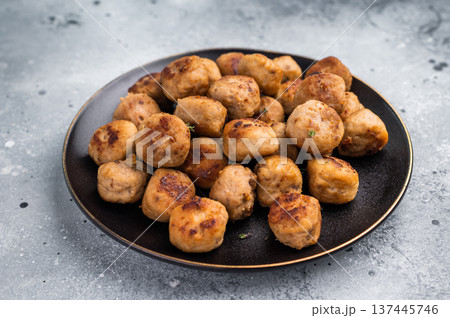 Savory meatballs, meat dumplings garnished with fresh herbs. A delightful addition to any meal, bringing warmth and satisfaction to the table. grey background. top view
