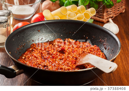 Minced meat fried in tomato sauce in frying pan