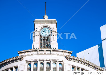 日本東京城市景觀,包括銀座四丁目、精工大廈銀座和銀座站(8 月 21 日)