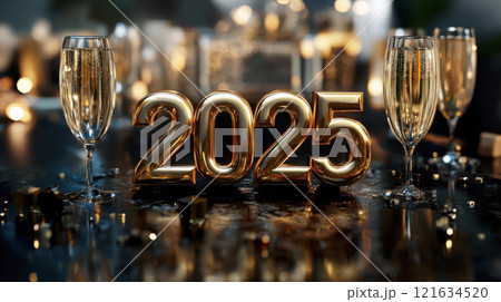 2025 sign in gold color text with glasses of champagne on a dark surface background.
