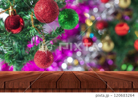 Festive kitchen backdrop with empty wooden table in foreground, Christmas tree and twinkling lights creating a warm, cozy atmosphere for holiday cooking and gatherings.