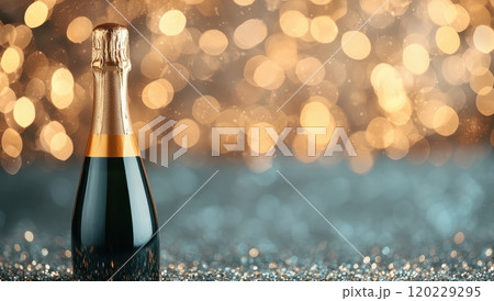Champagne bottle against a sparkling gold background. Concept of celebration, New Year's Eve, party