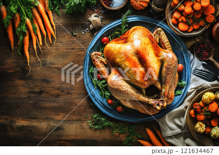 close up Whole roasted turkey with fresh vegetables and herbs and a white gravy boat filled with sauce, beautifully garnished. thanksgiving food concept.
