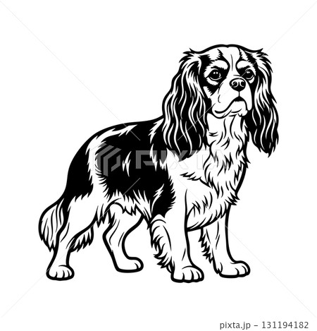 Vector of Cavalier King Charles Spaniel stands, its long, silky ears and gentle expression highlighted. The vector captures the breed's graceful and friendly nature. Pet.