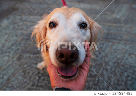 Cute golden Retriever dog caress on its chin by hand of his owner