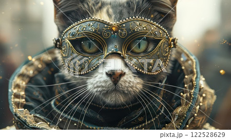 A cat with a golden mask looks intently at the camera. The cat's green eyes are piercing, and its whiskers are twitching.