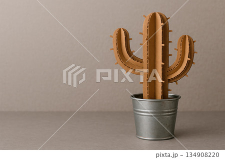 Cardboard cactus in a metal pot on a neutral background. Space for text.