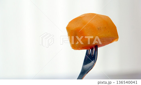 一個柿子,秋天的味道,用叉子叉起來。