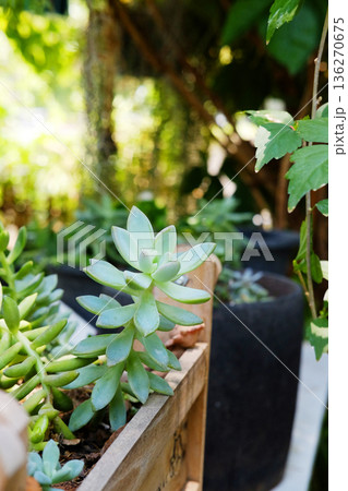 Blooming fresh succulents in wooden pickup truck pot of garden