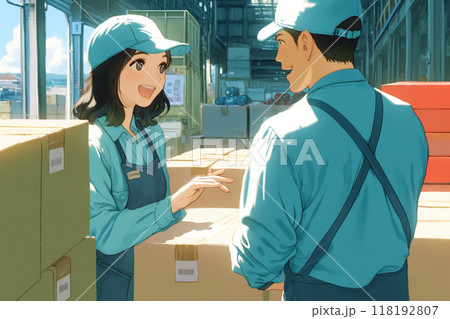 倉庫裡說話的男人和女人_精密插畫1