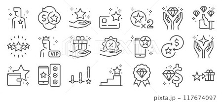 Star benefit icon. Reward premium quality line voucher, award loyalty program member card, star win prize symbols, coupon offer flat vector set