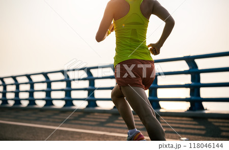 Asian fitness woman runner running on seaside bridge