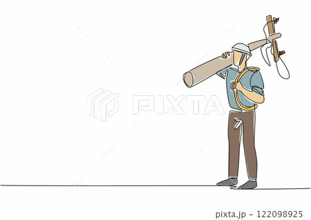 Single continuous line drawing lineman lifts electric pole and cable reel. Finds right installation point for electrical wiring. National Lineman Appreciation Day. One line design vector illustration