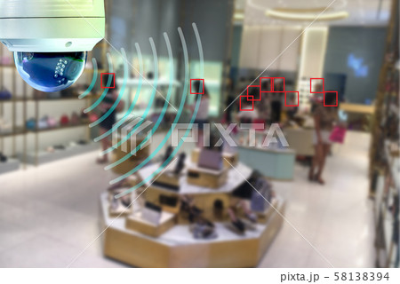 A Speed Dome CCTV infrared camera technology 4.0 for look security area of work in shopping mall show signage with security customers in area.
