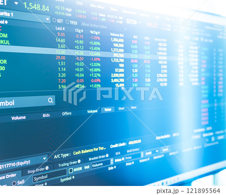 Displaying trading dashboard showing market data on monitor, with circular gauge and line charts