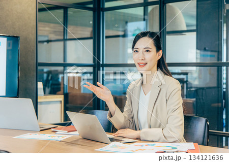 Intelligent analytics on screen with graphs and charts as business team reviews financial statement, discusses results, and aligns management decisions.