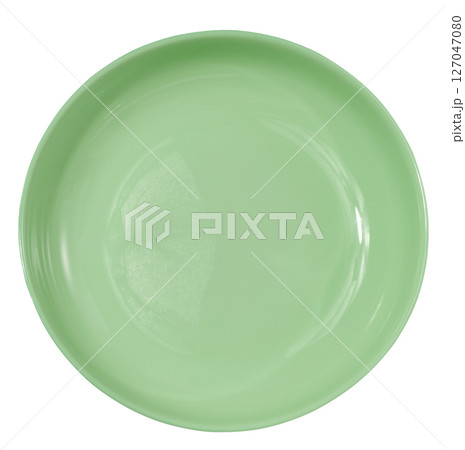 Top view on colored background empty round green plate on tablecloth for food. Empty dish on napkin with space for your design
