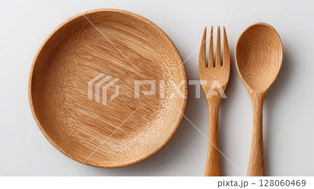 Eco friendly table setting with bamboo fork and spoon on wooden plate or bowl on white background. Sustainability, zero waste and natural living concept.
