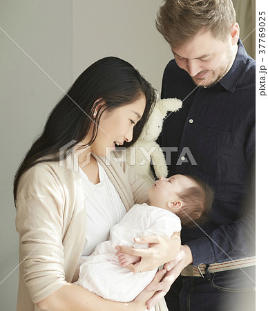 國際婚姻已婚夫婦抱著嬰兒的肖像