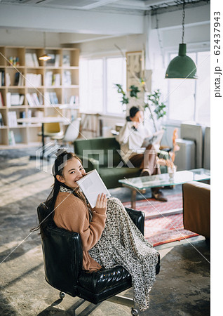 一位年輕女子在一間綠樹成蔭的房間裡看書
