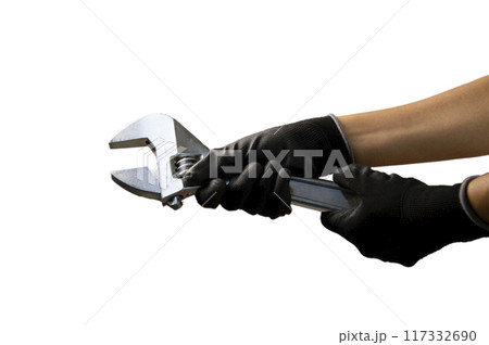Mechanic holding a large adjustable wrench Size 375mm, white background