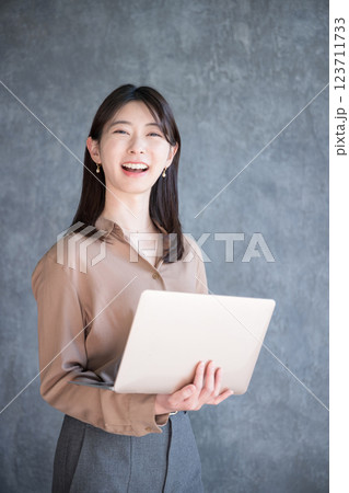 灰色背景中拿著筆記型電腦的女人
