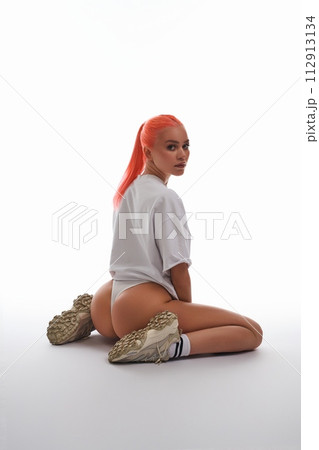 Alluring woman sitting on her buttocks in panties and t-shirt