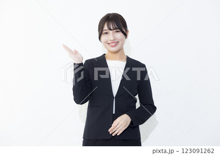 Young asian woman, smiling while pointing finger, recommending product, white background.