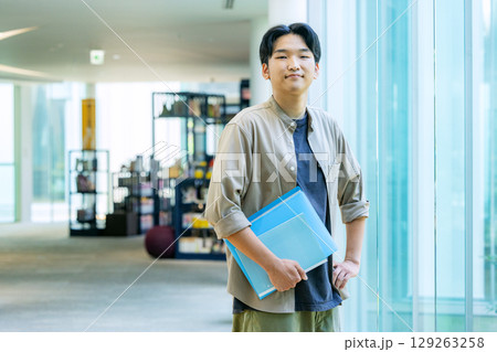 A smiling young Asian male college student stands by a brick wall on campus, carrying a backpack.