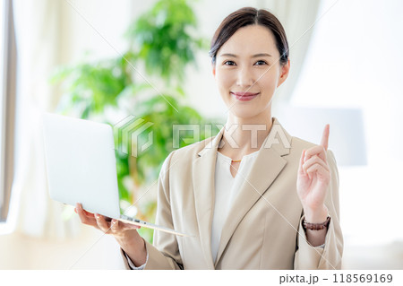 An attractive Asian businesswoman sits at her desk in the office, holding a coffee cup and a tablet.