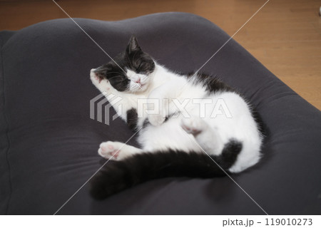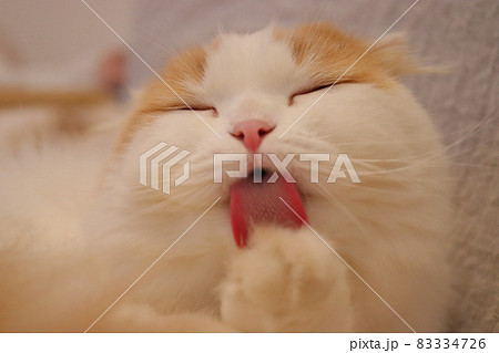 貓Nyasuke(蘇格蘭折耳貓)躺下來梳理