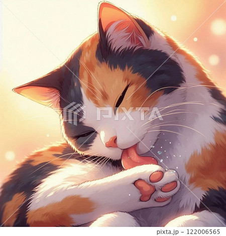 水彩畫:一隻正在梳理自己毛髮的花斑貓(動物、寵物)