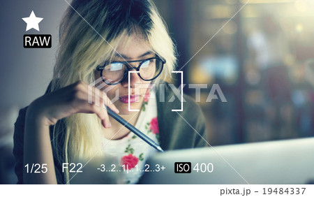 A woman in a coffee shop. Smiling. Head and shoulders.