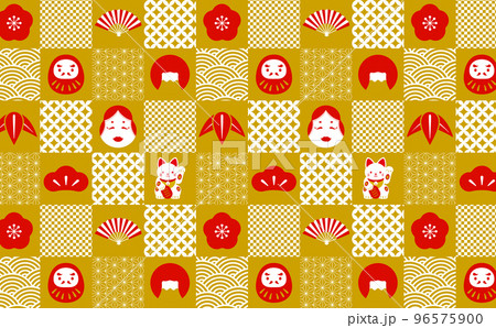 日本的象徵方格無縫圖案背景與日本幸運符_圖案註冊_金色和紅色