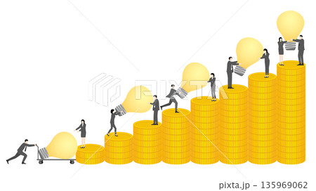 Business Team Working Together to Move Idea Lightbulbs Up Gold Coin Staircase for Wealth Growth and Strategic Investment Success Concept