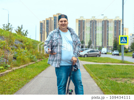 A cute man stands with a skateboard and a phone in his hand and smiles at the camera on a city street. A man with a plaid shirt stopped to call on his skateboard. Concept of a man with a skateboard.