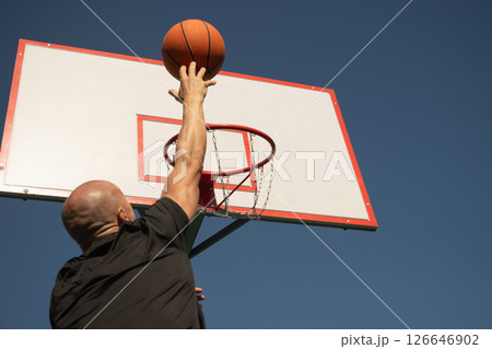 Basketball player or sporty man tries to throw ball into basketball hoop on sports court at courtyard. Street style. Game moment. Close up.