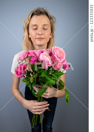 on light gray background a young blonde girl with a large bouquet of pink peony roses women's holiday March 8 first date emotions on the face smiling girl with eyes closed