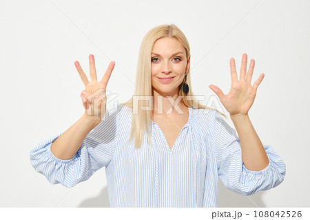 Woman shows eight fingers. Counting with fingers.
