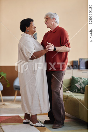 Vertical full length portrait of multiethnic senior couple dancing together enjoying romantic date indoors