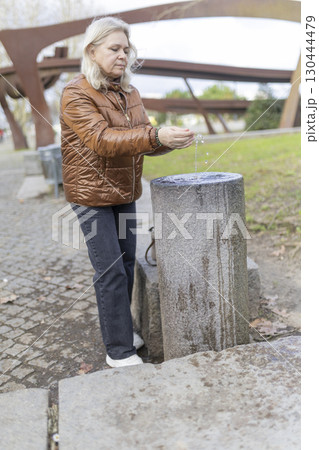Senior woman washing hands in public park fountain