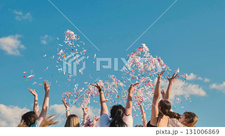 Students celebrating their graduation by tossing colorful confetti into the summer sky