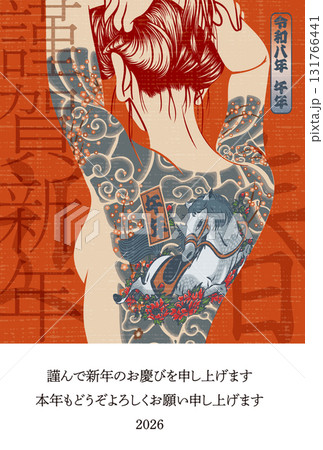 2026年新年賀卡模板「紋身女孩」新年快樂,帶有題字圖案