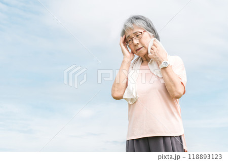 穿著運動服的亞洲女性在跑步/走路時患有頭痛/偏頭痛