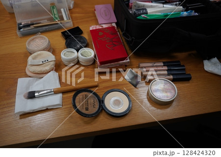 Make-up palette brush with cream foundation and blush colors shades. Beauty products makeup brush with pink and rouge color jars on stainless steel mixing tool for artist. Top view background